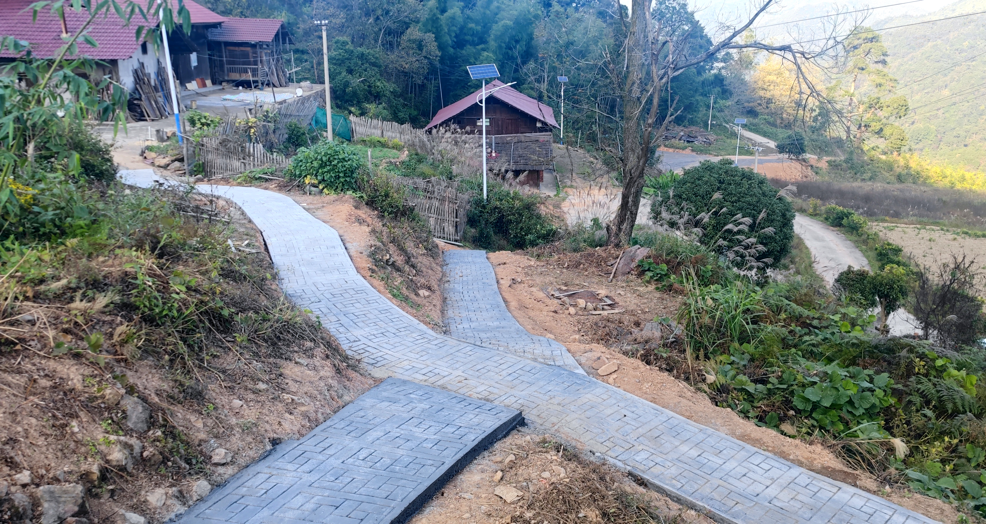 盘家村下岭江、王家、干田岭等村民小组地处偏远,且农户居住较为分散,通组公路至各家各户之间的入户小道多为泥土砾石小道,村民们出入经常是“晴天一身土,雨天一脚泥”,遇到雨雪天气在坡道上还容易摔跤。为有效解决居民出行困难的问题,工作队高度重视,将“修建便民小道”作为民生实事项目之一,实地走访了解实际情况后,与村民充分沟通需求,确定详细的提质改造方案,在村委会的大力支持下,有序组织修建工作,建成总长约505米,宽约1至2米的小道。目前,该便民小道已投入使用。
